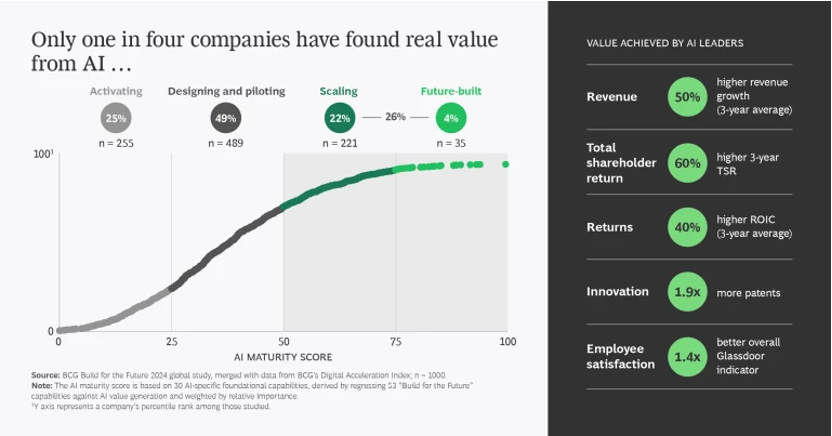 人工智慧的發展已從單純的技術潮流,轉變為企業價值創造的核心戰場。波士頓顧問公司(BCG)2025年的全球研究指出,全球僅有約5%的企業能在AI投資上獲得實質的收益,並將這些成果轉化為營收與現金流的成長。而多達六成的企業雖投入龐大資源,卻未能產生具體效益。這種「AI價值鴻溝」正快速擴大,成功者不僅以AI重塑決策與流程,更憑藉再投資與創新形成滾動式優勢。