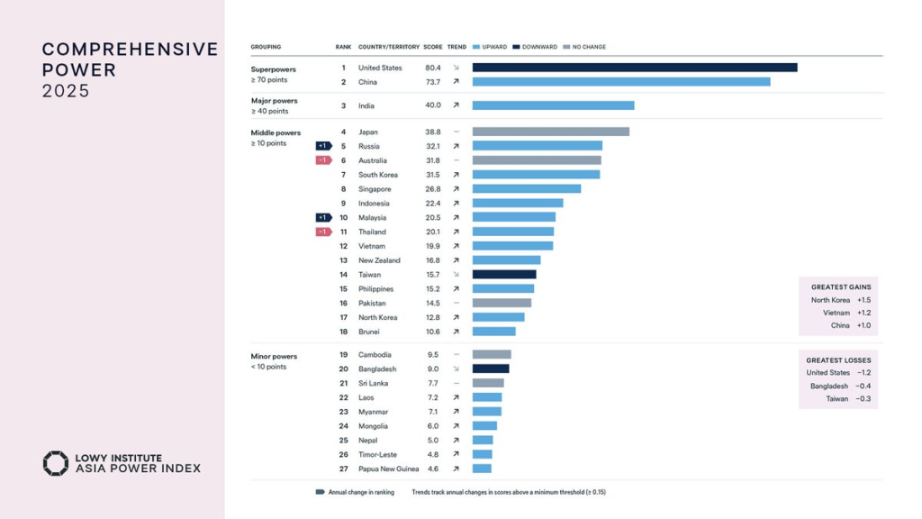 俄羅斯則是今年最大的反彈者,在持續受到西方制裁與戰爭消耗的情況下,俄羅斯的經濟展現出超乎預期的韌性,其軍事能力因持續的戰時動員與戰場經驗累積而獲得更高評價。在外交上,俄羅斯加強與中國、北韓以及部分東南亞國家的合作,使其區域角色重新受到關注,尤其是與北韓的新型安全合作,使俄羅斯在亞洲的軍事網絡更具存在感,雖然其經濟影響力仍然有限,但其軍事與外交操作已足以使其排名重新超越澳洲。